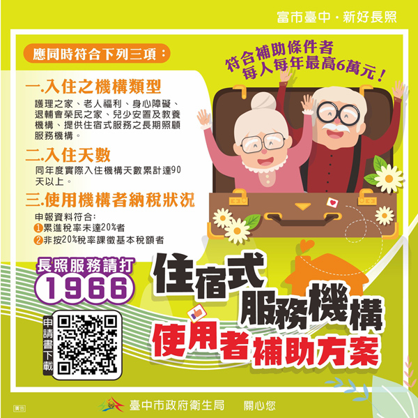 台中市衛生局表示,台中市住宿式機構服務的使用者,只要同時符合三項條件,最高可申請補助6萬元。包括入住機構類型為一般護理之家、精神護理之家、老人福利機構(除安養床外)、身心障礙機構、兒童及少年安置及教養機構(依兒童及少年福利與權益保障法委託安置且領有身心障礙手冊/證明者,以及機構住宿式服務類長期照顧服務機構等;整年度實際入住天數達90天;2019年所得稅率未達20%者。